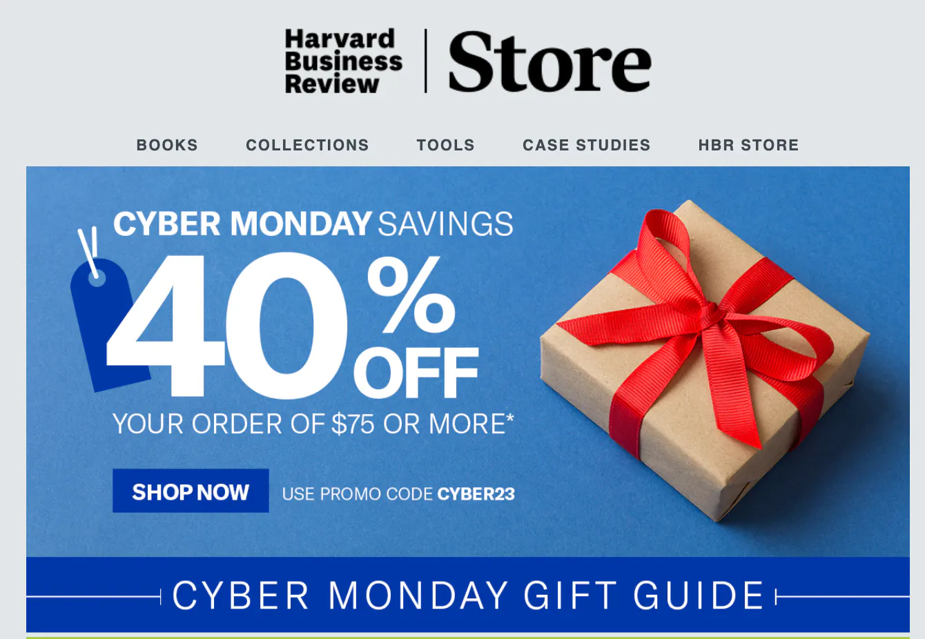 Email promos from Harvard Business Review offer deep discounts for users who have shown intent by previously engaging with their content.